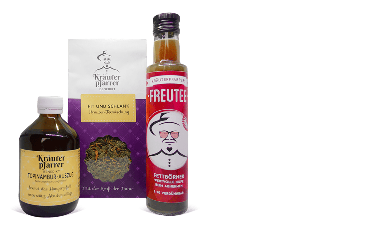 Haben Sie Probleme mit dem Gewicht? Möchen Sie das Abnehmen auf natürliche Weise unterstützen? – Dann empfehlen wir Ihnen unsere Aktion „Für eine schlanke Linie“. Von der Teemischung „Fit und schlank“, die sich aus Fenchelkörnern, Schlehenblüten, Löwenzahnkraut, Dostkraut und Ringelblumen-Blüten zuammensetzt, kann man je nach Geschmack täglich 2 bis 3 Tassen trinken. Vom leicht alkoholhaltigen Topinambur-Auszug am besten vor jeder Hauptmahlzeit 1 Teelöffel voll zu sich nehmen. Auch zwischendurch kann 1 Teelöffel voll eingenommen werden, wenn man z. B. ein Verlangen nach etwas Süßem hat. Der Freutee „Fettbörner“ ist ein Tee zum Verdünnen, der dieselben Kräuter enthält wie die Teemischung „Fit und schlank“. Als wohltuendes Getränk zwischendurch kann man davon 3/4 l bis 1 l täglich trinken. Einfach 1 : 10 mit heißem oder kaltem Wasser aufgießen, schon ist der wohltuende Trunk fertig. Durch diese Anwendungen in Kombination mit einer gesunden ausgewogenen Ernährung und ausreichend Bewegung kann das Abnehmen auf natürliche Weise unterstützt werden.