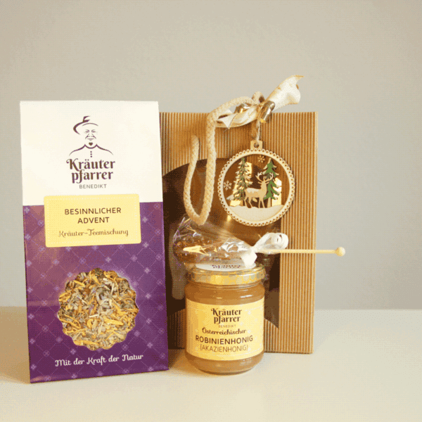 Die Teemischung „Besinnlicher Advent“ kann uns helfen, in der stressigen Adventzeit Ruhe und Besinnung zu finden. Apfelschalen, Hagebutten, Anis, Heidkraut, Lavendel, Melisse, Salbei, Ysop, Koriander und Ringelblume sind enthalten. Möchte man einen etwas herben Honig mit hohem Fermentgehalt, ist der Edelkastanienhonig genau richtig. Er hat einen hohen Wert elektrischer Leitfähigkeit und eignet sich als Brotaufstrich, zum Süßen von Tees oder als gesunde Nascherei.