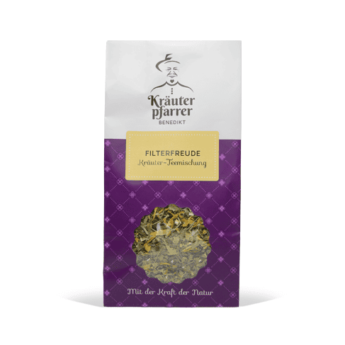 Die Teemischung „Filterfreude“ enthält eine Kombination aus Birkenblättern, Kamille, Lindenblüten, Erdbeerblättern, Pfefferminze, Ringelblumenblüten und Zinnkraut. Diese Kräutermischung ist eine wohltuende Ergänzung zu einer ausgewogenen Ernährung und kann als genussvolles Getränks während des Tages genossen werden.