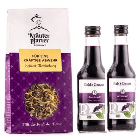 „Vorbeugen ist besser als Heilen“, diese allgemein bekannte Aussage scheint derzeit wichtiger denn je. Um Erkältungskrankheiten vorbeugen bzw. entgegenwirken zu können, benötigt unser Organismus ein gestärktes Immunsystem. Es gibt kaum Krankheiten und Befindlichkeitsstörungen, denen man so erfolgreich vorbeugen kann wie den Erkältungskrankheiten. Die Teemischung „Für eine kräftige Abwehr“ kann hier unterstützend wirken. Diese setzt sich zusammen aus Hagebuttenfrüchten, Ysop, Brennnessel, Himbeerblättern, Melisse, Thymian und Ringelblumenblüten. Von dieser Teemischung nimmt man dreimal täglich 1/4 l schluckweise, 3 Wochen lang, 1 Woche aussetzen, 3 Wochen wiederholen. Um das Immunsystem zu stärken ist auch der Aroniasaft besonders empfehlenswert. Dieser Saft hat einen kräftigen, leicht herb-säuerlichen Geschmack und eine sehr intensive rote Farbe. Unverdünnt liegt die täglich Trinkempfehlung vom Direktsaft bei ca. ein- bis zweimal 50 ml pro Tag. Am besten nimmt man den Saft nach dem Frühstück und abends vor dem Schlafengehen. Die Aronia oder Apfelbeere ist ein sehr robuster Strauch, der keine Pflanzenschutzmaßnahmen benötigt. Nach der Blüte im Mai werden im September die violett-schwarzen erbsengroßen Früchte geerntet. Sie schmecken säurerlich-herb, ähnlich der Heidelbeere. Der kalt gepresste Saft wird schonend durch Erhitzen haltbar gemacht.