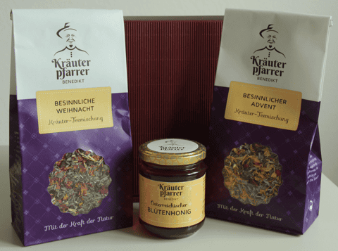 Durch den Stress und die Unruhe unserer Zeit ist es leider vielen Menschen nicht möglich, der heiligen Weihnacht mit offenem Herzen und frohem Sinn entgegenzugehen. Um dies etwas zu erleichtern, hat der Kräuterpfarrer die Teemischungen „Besinnlicher Advent“ und „Besinnliche Weihnacht“ kreiert. Außer dem ausgezeichneten Geschmack ist der Tee „Besinnliche Weihnacht“ durch die enthaltenen Rosenblüten und Goldmelissenblüten eine wahre Augenweide. Mit etwas Honig verfeinert rundet dies den Geschmack ab.